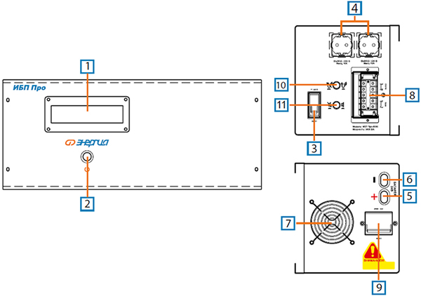 1 - панель индикации режимов работы. 3 - автоматический выключатель сети. 5 - провод с клеммой (+) постоянного тока положительной полярности. 7 - вентилятор принудительного охлаждения. 9 - автоматический выключатель цепи постоянного тока. 11 - кнопка включения / отключения звукового сигнала. |