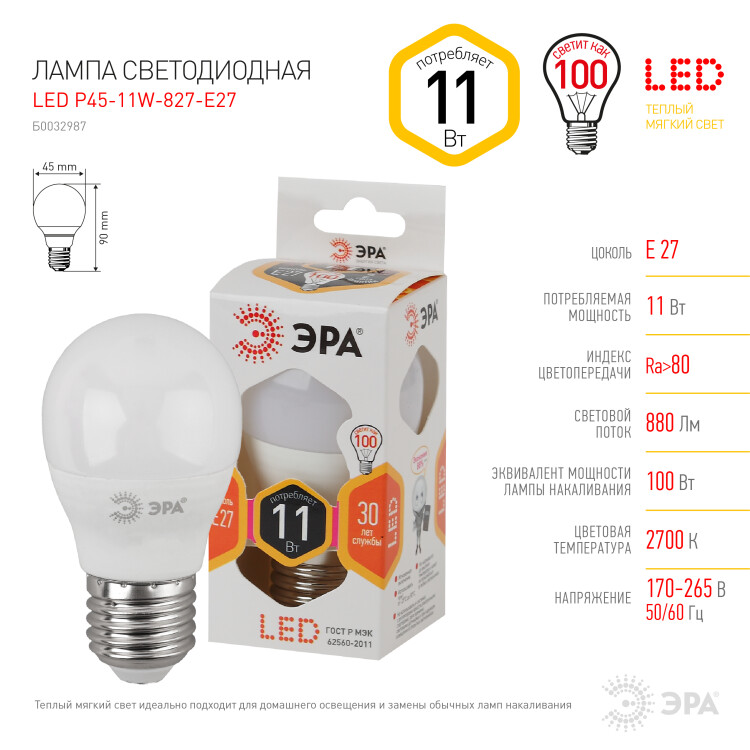 Лампа шар свд Е27 11Вт 2700К 880лм Р45 матовая ЭРА