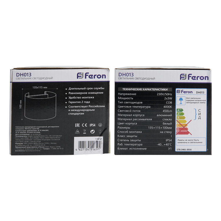 Светильник уличный светодиодный, на стену (ДБУ) FERON DH013, серия Майами, 6W, 4000К (белый натуральный), 230V/50Гц, 450Lm, IP54, 2LED*COB, класс защиты 1, раб.t -40°C...+40°C, цвет белый, корпус алюминий, 100*115*135мм,