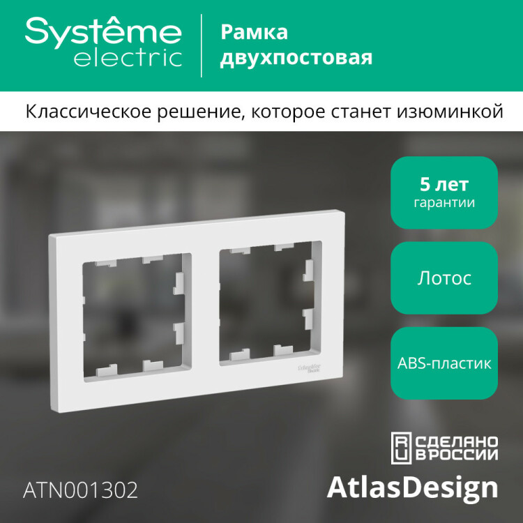 Рамка Systeme Electric (ранее Schneider Electric) серии AtlasDesign в цвете лотос двухместная. Устанавливается в вертикальном и горизонтальном положениях. Лицевые детали из качественного ABS-пластика, устойчивого к царапинам и УФ-излучению. Позволяет гармонично вписать электроустановочное изделие в интерьер помещения.