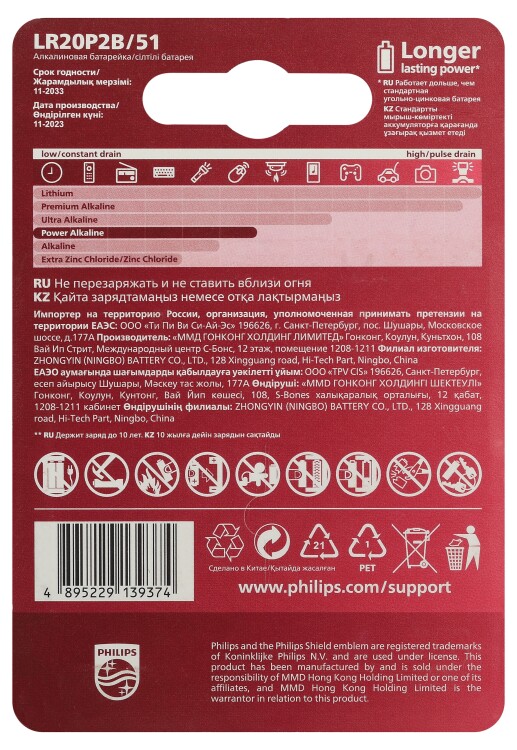 • Щелочные батареи Philips содержат 0 % кадмия, ртути и свинца