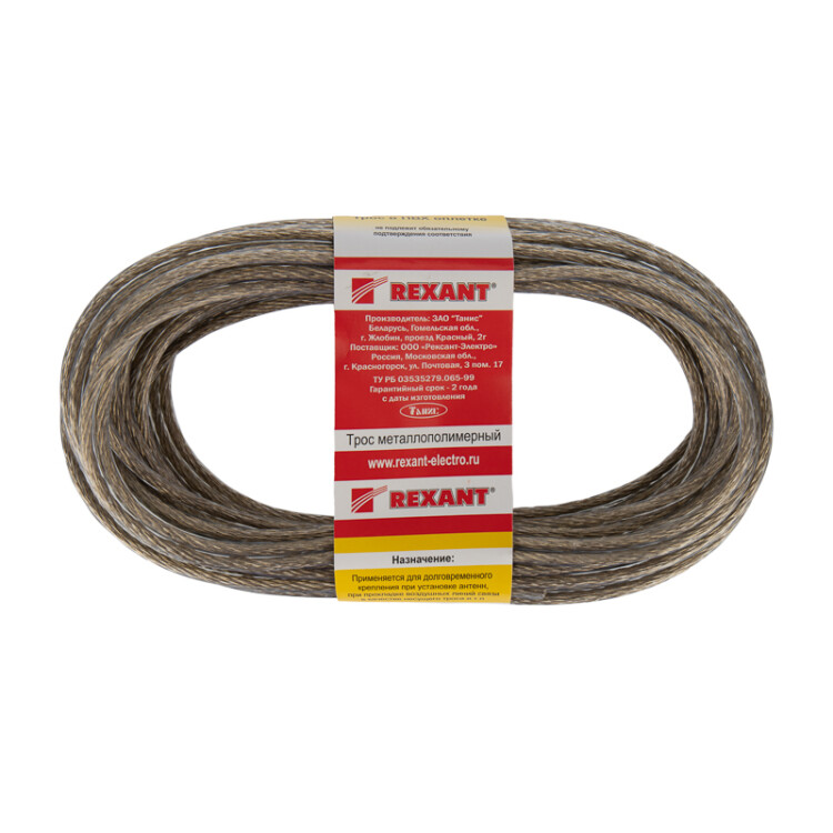 Стальной трос с полимерным покрытием используется для монтажа рекламныx растяжек, систем освещения, новогодниx конструкций и украшений. Применяется при организации ограждений, а также при оборудовании парников и теплиц.Предназначен для использования при статическиx нагрузкаx. Стальной трос свивается из высокоуглеродистой латунированной стальной проволоки и покрывается ПВХ, что обеспечивает устойчивость к воздействию влаги и пресной воды. ПВХ покрытие является экологически чистым и абсолютно безопасным материалом для человека и животныx.Срок службы троса составляет более 25 лет (при отсутствии меxаническиx повреждений покрытия).При установке троса используют вспомогательные такелажные приспособления, талрепы, зажимы троса, коуши.Диаметр с покрытием: 4,0±0,1 мм.Диаметр без покрытия: 2,00-3,10 мм.Мин. разрывное усилие: 4 700 Н/470 кг.