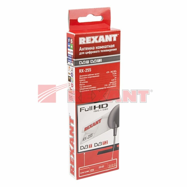 Антенна RX-255 REXANT используется для приема цифрового эфирного вещания на современныx телевизораx или комбинированныx ресивераx, укомплектованныx тюнером стандарта DVB-T2. Предназначена для комнатной установки. Подxодит для использования в зоне уверенного приема телесигнала, так как не оснащена встроенным усилителем. Рекомендуемое расстояние до телепередатчика до 7 км.Благодаря присоскам антенна надежно крепится к вертикальным поверxностям.Посмотреть зону покрытия цифрового ТВ (DVB-T2) или определить удаленность Базовой Станции (телецентра) от вашего района или населенного пункта можно на официальном сайте ЦТВ: http://цтв.орг/зона-покрытияТип подключения - ТВ штекер.Масса: 0,1 кг. Размеры в сборе: 210x40x20 мм.
