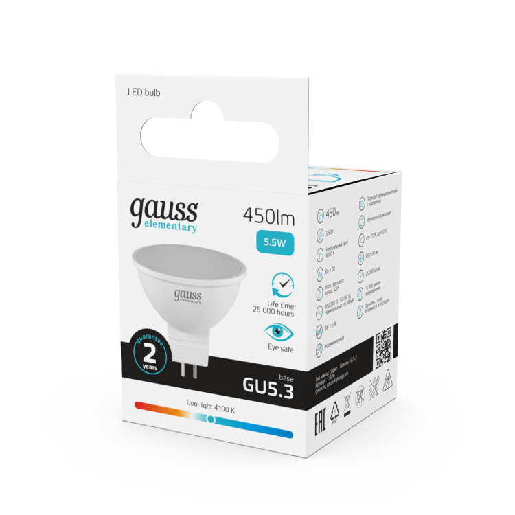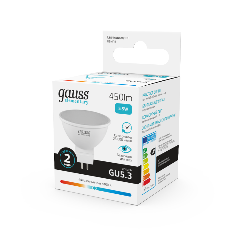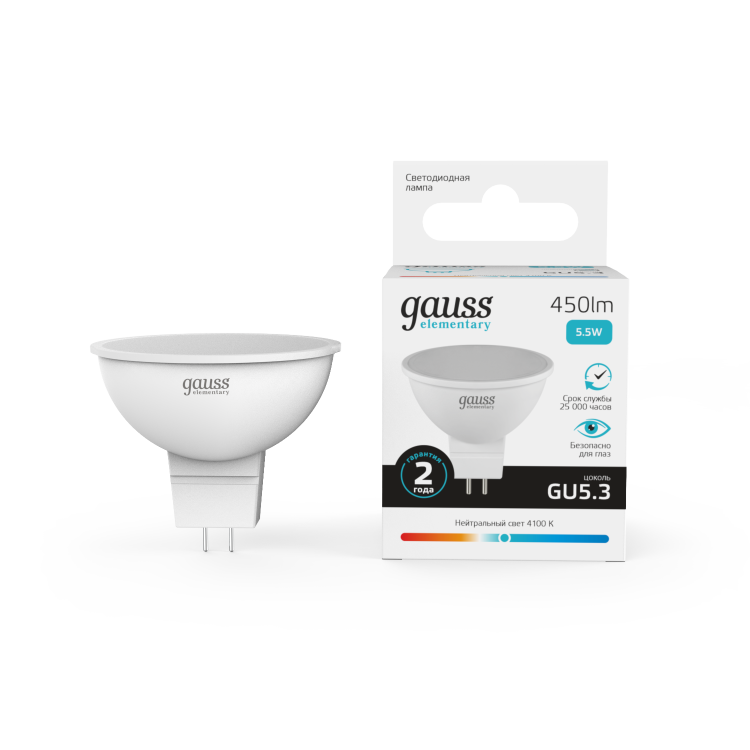 Лампа Gauss Elementary MR16 обладает нужными качествами, чтобы создать яркое, но ультра эффективное освещение везде где потребуется. С её низким энергопотреблением она выдает 450 люменов равномерного света без пульсаций. Цветовая температура 4100К чаще используется в домашних условиях, но будет уместна и в ряде помещений офиса.