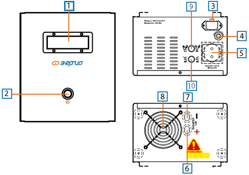 1 - панель индикации режимов работы. 3 - сеть. 5 - бытовая розетка типа F выходной цепи с заземлителем. 7 - провод с клеммой (-) постоянного тока отрицательной полярности. 9 - кнопка включения / отключения режима энергосбережения. |