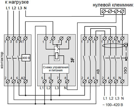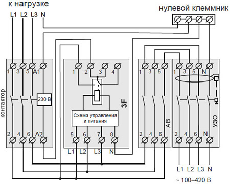 | Возможный вариант подключения УЗО, автоматического выключателя и контактора с катушкой на 230 В. |