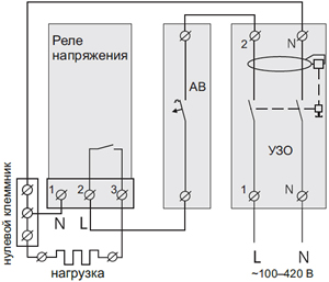 - Для защиты от короткого замыкания и превышения мощности в цепи нагрузки обязательно необходимо перед реле установить автоматический выключатель (АВ), который устанавливается в разрыв фазного провода, как показано на схеме, и должен быть рассчитан на номинальный ток нагрузки.