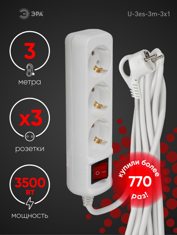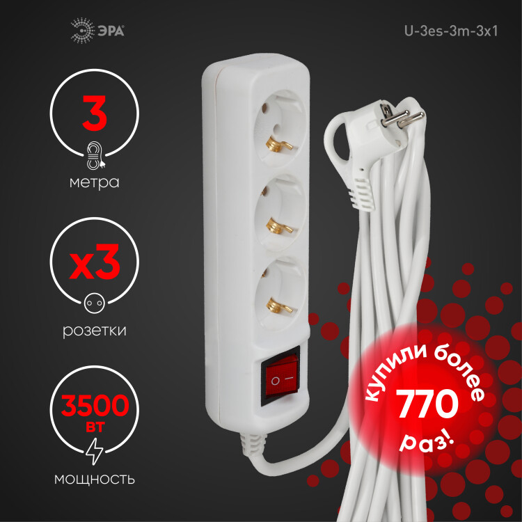 Удлинитель электрический Эра U-3es-3m-3x1 с заземлением, с выключателем, ПВС, 3x1мм2, 3 розетки, 3 м. Рассчитан на максимальную мощность 16А/3500 Вт. Удлинитель Эра станет Вашим надежным помощником, если Ваши любимые электроприборы находятся далеко от розеток. Провод в удлинителях Эра сделан из 100% меди, что делает его абсолютно пожаробезопасным. Корпус выполнен из ударопрочного и негорючего пластика (полипропилен). В моделях с заземлением у вилки есть кольцо для удобного извлечения из розетки. Модель удлинителя на 16А позволяет подключить мощные бытовые приборы общей нагрузкой до 3500Вт. Не бойтесь включить чайник, обогреватель, микроволновку или другие электроприборы. Толстый провод удлинителя Эра гарантирует полную безопасность. Дизайн удлинителя разработан в России командой Эра Style.