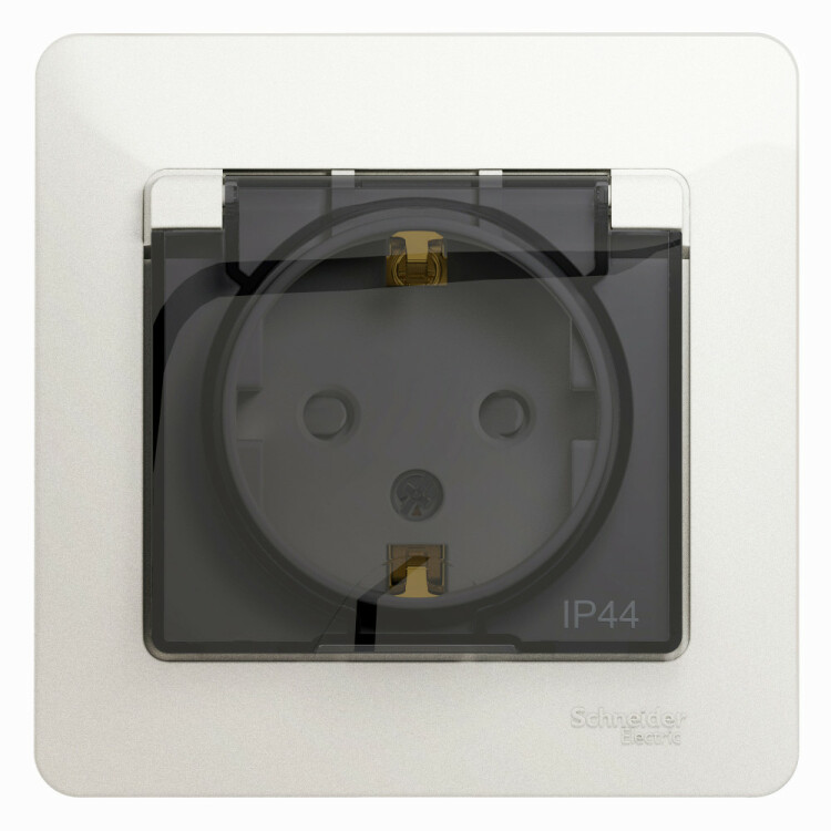Розетка Systeme Electric (ранее Schneider Electric) серии Glossa (в сборе, цвет перламутр) одинарная с заземлением, шторка ми и крышкой подходит для сетей 250 В, на ток 16 А. Изделие со степенью защиты IP44 обеспечит безопасность использования в ванной и на кухне. Заземляющий контакт обеспечивает дополнительную защиту от удара электрическим током. При наличии заземления электрический потенциал уходит в землю, защищая человека. Выполнен из материала PС+ASA, стойкого к УФ-излучению и появлению царапин.