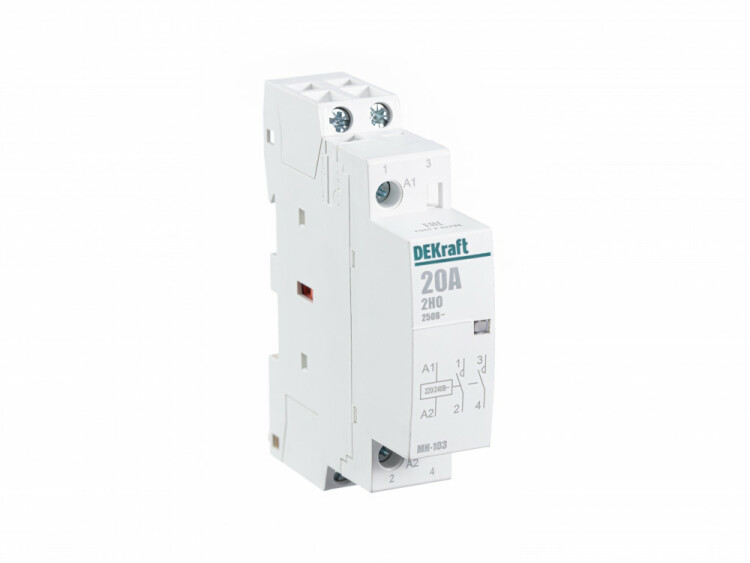 Модульный контактор серии МК-103 Dekraft; ном.ток 20 А (АС-7а); кол-во и исполнение контактов – 2НО; напряжение управления 220 В пер.тока; ширина – 1 мод. х 18 мм; установка – на DIN-рейку. Контакторы МК-103 применяются в сетях напряжением до 400 В пер.тока для дистанционного управления небольшими нагрузками, требующими большого количества включений / отключений, например, насосы, системы вентиляци и и т.п. Модульные контакторы не требуют дополнительных настроек и специального обслуживания.