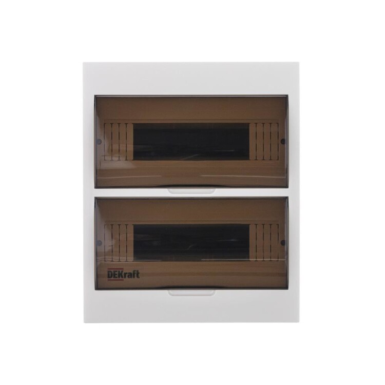 Корпус пластиковый навесной серии ЩРН-П IP41 RAL 9002 (светло-серый) используют для установки модульных устройств. Дизайн дверц корпуса имеет скругленные формы. Фронтальные части корпуса, дверцы, основание корпуса изготавливаются из самозатухающего ABS-пластика. Корпус имеет штампованные вводы для кабелей с разных сторон, и расстояния до точек крепления указаны сзади. Корпус является встраиваемым, имеет 2 черных DIN-рейки и 24 модулей (18 мм) для установки устройств, изолированные держатели для шинок, шинки N и PE. Дверцы на каждый ряд фиксируются в верхнем положении. Щиток на 100% совместим с модульным оборудованием Dekraft и Systeme Electric.
