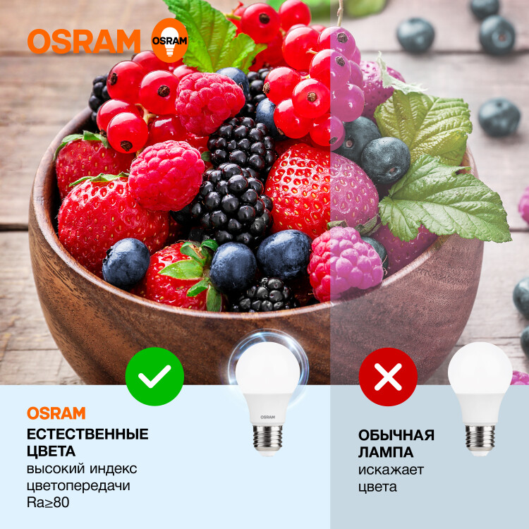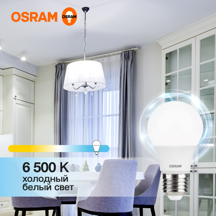 Лампа светодиодная OSRAM LED Value A, 560лм, 7Вт (замена 60Вт), 6500К (холодный белый свет). Цоколь E27, колба A, угол пучка 180. Исполнение колбы матовое, пластик. Напряжение питания 220-240В. Товар сертифицирован.