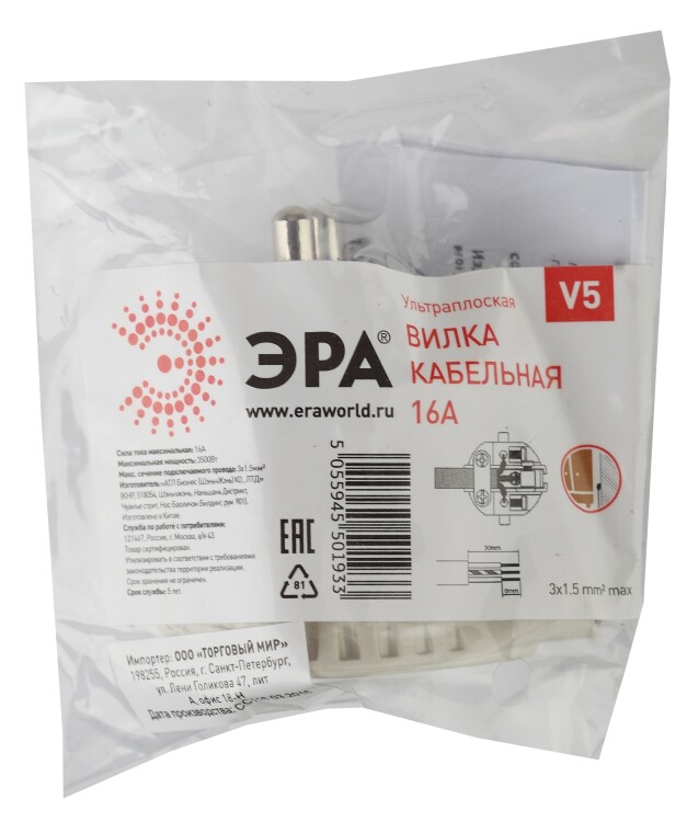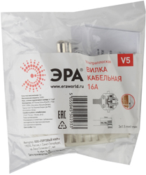 Вилка электрическая плоская угловая V5 "Эра" Б0019192 (16 А, IP20) с заземлением, белый