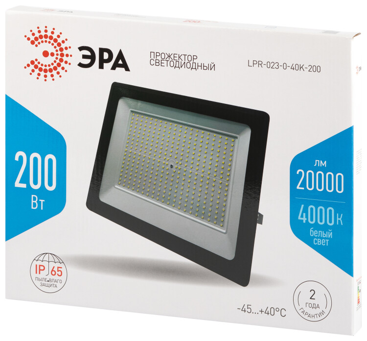 Мощный прожектор ЭРА LPR-023 200 Вт отличается удлинённым кабелем длиной 30 см, что упрощает подключение к распаячной коробке. Цветовая температура — 4000 К. Световой поток — до 20 000 лм. Прочный корпус из литого алюминия с порошковым покрытием оснащён закалённым стеклом, эффективно защищающим светодиоды. Количество светодиодов — 224.