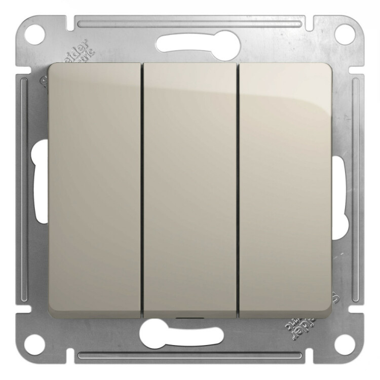 Механизм Systeme Electric (ранее Schneider Electric) серии Glossa (цвет молочный) выключателя 3-клавишного подходит для сетей 250 В, на ток 10 А. Трёхклавишный выключатель позволяет управлять тремя источниками света из одной точки. Выполнен из материала PС+ASA, стойкого к УФ-излучению и появлению царапин. Эргономичные клеммы расположены в два ряда: сверху и снизу.