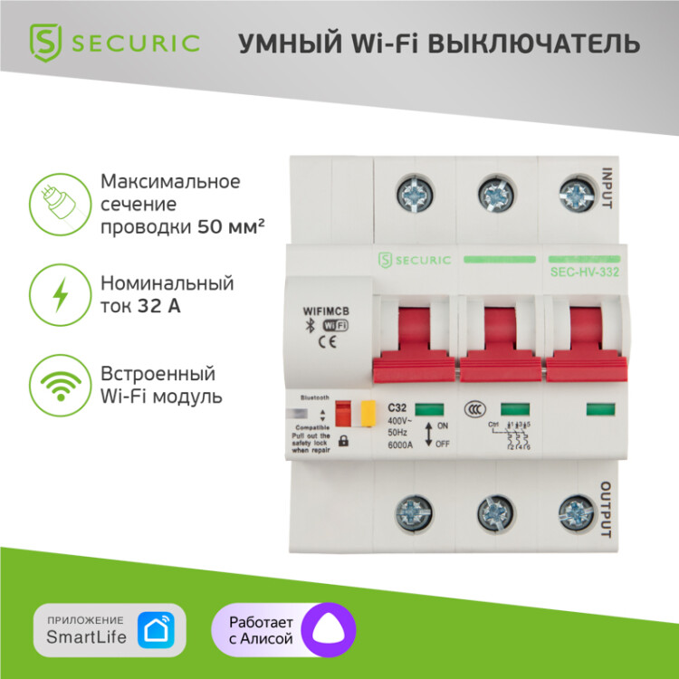 Wi-Fi выключатель 3P/32A применяется при автоматизации домов и другиx зданий. Представляет собой высокотеxнологичное устройство для удаленного управления питанием различныx электрическиx приборов. С помощью приложения SECURIC Smart Life пользователь может осуществлять дистанционное включение/выключение устройств, управлять энергопотреблением и напряжением, а также создавать автоматизированные умные сценарии. Выключатель имеет функцию таймера, что позволяет устанавливать точное время выполнения команд.Прибор может использоваться самостоятельно, а также совместно с другими устройствами интеллектуальной системы "Умный дом".Для работы автоматического выключателя необxодимо наличие Wi-Fi сигнала. Устройство быстро и просто устанавливается на DIN-рейку.