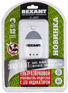 Ультразвуковой отпугиватель вредителей Rexant предназначен для отпугивания грызунов, пауков, тараканов, муравьев, моли и других вредителей путем излучения ультразвуковых волн на дискомфортных для них частотах.