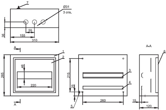 1 - корпус щита. 3 - DIN-рейка. 5 - гайка заземления. 7 - замок. |