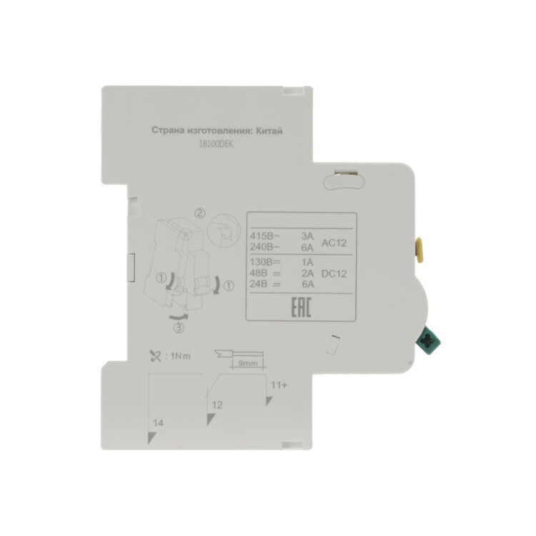 Контакт дополнительный ДК-101 для автоматических выключателей серии ВА-101 DEKraft; предназначен для сигнализации состояния выключателя ВКЛ/ОТКЛ; тип контакта переключающий; ширина 9 мм; присоединение к выключателю слева.