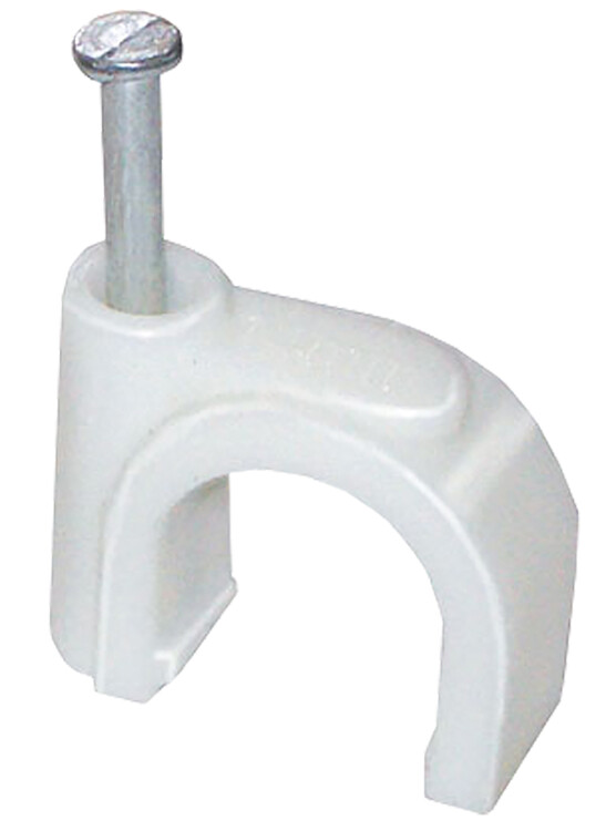 Скоба с гвоздём предназначена для быстрого и надежного крепления круглых кабелей к дереву, прессованному картону, швам кирпичной кладки, к штукатурке, бетону, кирпичу. Изготовлены из гибкого негорючего ударопрочного полипропилена, гвоздь - закаленная оцинкованная сталь.
