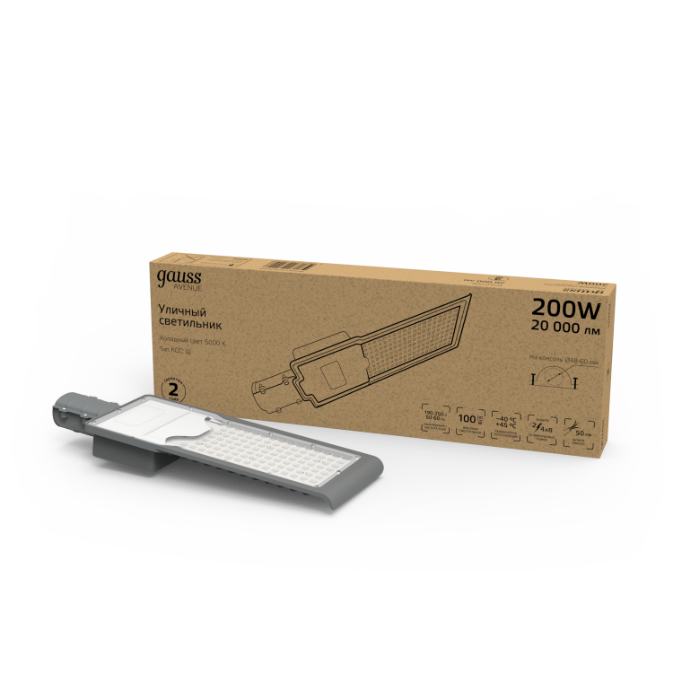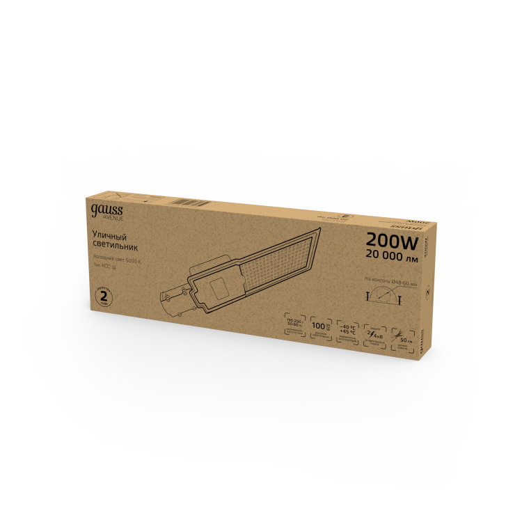 Светильник уличный Gauss LED Avenue - это яркий LED светильник консольного типа с высоким уровнем защиты от внешних среды IP 65 и широкой КСС, который отлично справится с освещением участков дорог, дворов, парков, территории дачи, строительных объектов, спортивных площадок. У светильника холодный белый свет 5000К, яркость диодов в совокупности составляет 20000лм. Корпус изготовлен из алюминия, с прозрачным рассеивателем. Светильник надежно защищен от импульсных помех и перепадов напряжения сети.