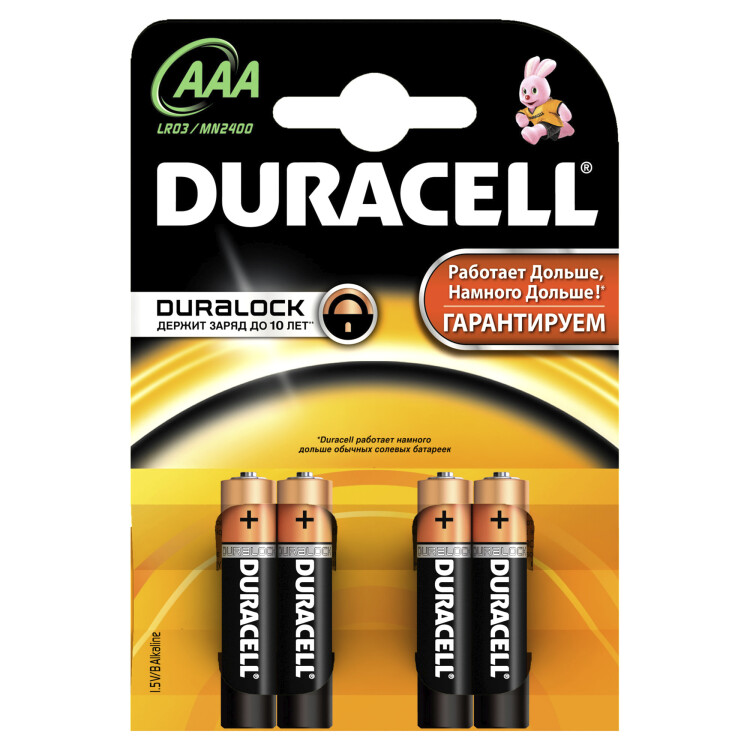 Щелочные батарейки Duracell Basic типоразмера ААА - надежный источник питания для часто используемых устройств, таких, как механизированные игрушки, фонарики, портативные игровые консоли, пульты дистанционного управления и т.д.