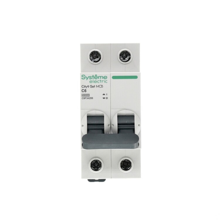 Автоматический выключатель серии City9 Set Systeme Electric, 2-полюсный, номинальный ток 6 А, характеристика С, Icn = 4.5 кА. Применяется в электрических сетях напряжением 230 В. Предназначен для защиты от перегрузок и токов короткого замыкания. Оснащен механизмом «мгновенной коммутации». Ударопрочный корпус из специального пластика с 6 металлическими заклепками. Безопасные клеммы исключают попадание кабелей в заклеммное пространство (ранее Schneider Electric Easy9 EZ9F34206).