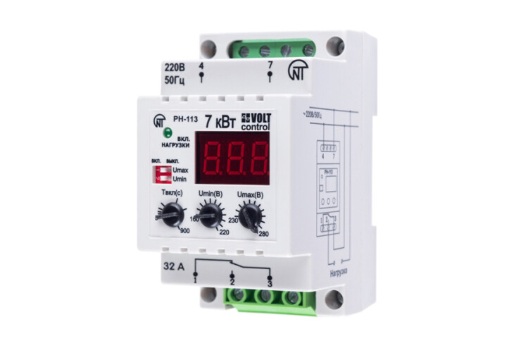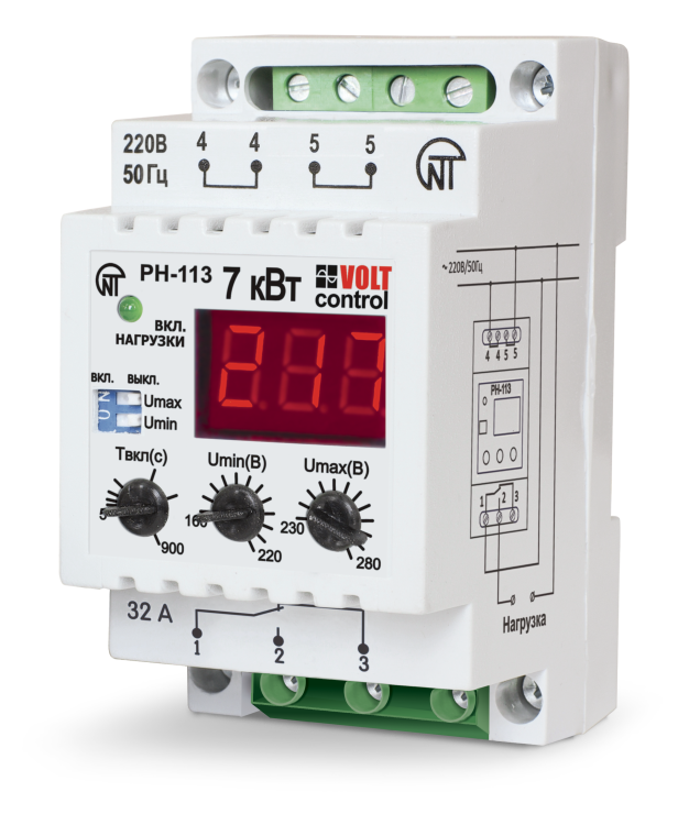 РН-113 предназначено для отключения бытовой и промышленной однофазной нагрузки любой мощности при недопустимых колебаниях напряжения в сети (после восстановления параметров сети включение произойдет автоматически). При мощности нагрузки до 7,0 кВт (ток до 32 А) отключение производится непосредственно РН-113, выходные контакты которого включены в разрыв питания нагрузки. При мощности, превышающей 7,0 кВт (ток более 32 А), отключение производится магнитным пускателем соответствующей мощности, в разрыв питания катушки которого включены выходные контакты РН-113 (МП в комплект поставки не входит). РН-113 индицирует действующее значение входного напряжения и состояние выходного реле нагрузки.