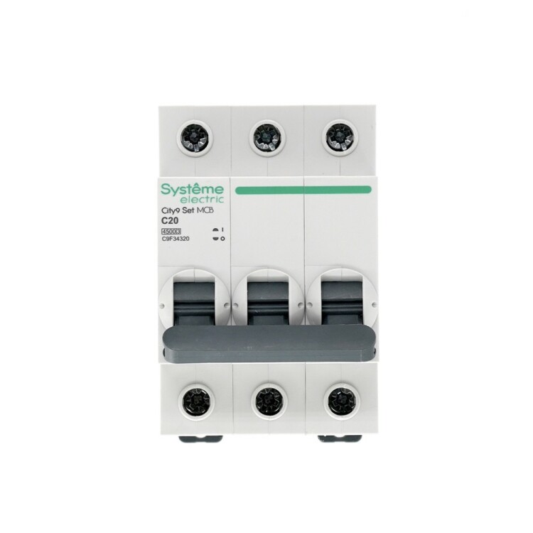 Автоматический выключатель серии City9 Set Systeme Electric, 3-полюсный, номинальный ток 20 А, характеристика С, Icn = 4.5 кА. Примен яется в электрических сетях напряжением 400 В. Предназначен для защиты от перегрузок и токов короткого замыкания. Оснащен механизмом «мгновенной коммутации». Ударопрочный корпус из специального пластика с 6 металлическими заклепками. Безопасные клеммы исключают попадание кабелей в заклеммное пространство (ранее Schneider Electric EZ9F34320).