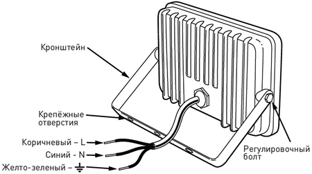 - Подключение прожектора к сети переменного тока производится с помощью трехжильного сетевого провода (фаза, нейтраль и заземление).