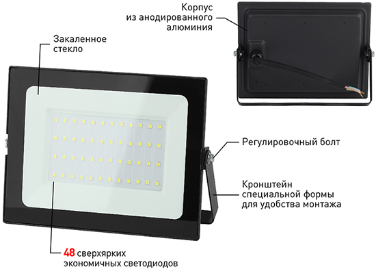 - Прожектор оснащен П-образным кронштейном, с возможностью регулировки угла наклона.