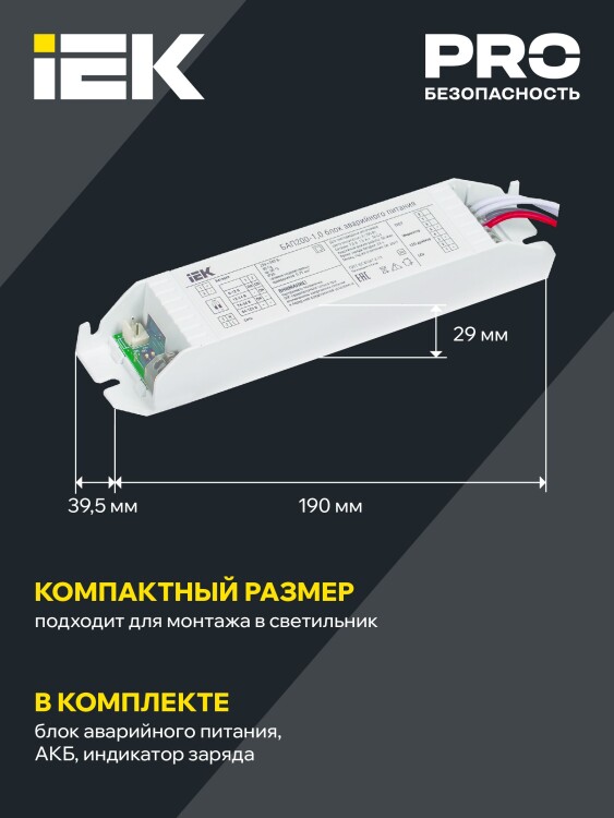 Блок аварийного питания (БАП) предназначен для обеспечения бесперебойного освещения помещений светодиодными светильниками в случае непредвиденного отключения сети 230В. БАП200 позволяет питать постоянным напряжением от 0 до 120В (регулируется DIP-переключателем) светодиодные модули различных конфигураций. Обязательным условием является наличие доступа к драйверу. Блок аварийного питания IEK состоит из электронного пускорегулирующего аппарата (конвертера), герметичной никель-кадмиевой аккумуляторной батареи, светодиодного индикатора наличия сети и подзарядки аккумулятора с кнопкой "ТЕСТ".