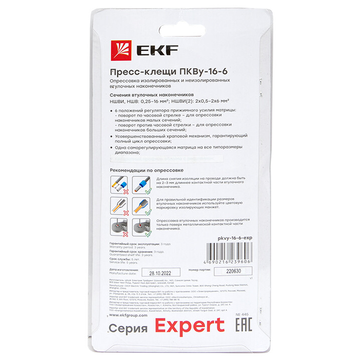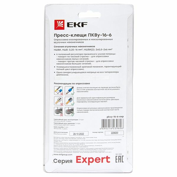 Пресс-клещи pkvy-16-6-exp предназначены для НШВИ наконечников сечением 0,25-16 мм2 и НШВИ(2) наконечников сечением 2х0,5-2х6 мм2. Кримпер с шестисегментной матрицей с автоматической настройкой на необходимый размер гильзы. Инструмент оснащен храповым механизмом с возможностью разблокировки на любом этапе опрессовки. Профиль опрессовки - шестигранник.