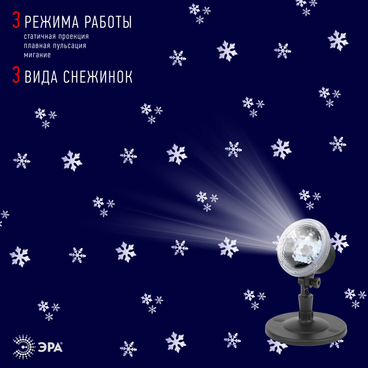 Светодиодный проектор "Метель" от ТМ ЭРА (арт. Б0047980) создает световой рисунок из снежинок с тремя видами узоров. Все снежинки классического белого цвета, что позволяет получить эффект настоящего природного снегопада. Даже если за окном тёплая и малоснежная зима, на вашем новогоднем празднике будет метель. И незабываемая атмосфера. Выбирайте любой из трёх режимов работы и меняйте их, когда захотите: статичные застывшие снежинки, анимированный снегопад или весёлая праздничная пульсация. Проекция хорошо смотрится на стене, потолке или фасаде здания. Прибор применяется как дома, так и снаружи помещений. Защищён от пыли и влаги по международному классу IP44, не боится осадков и морозов. В наборе 2 подставки: заострённая ножка для установки в снег или грунт + широкое основание для горизонтальной поверхности. Есть пазы для подвешивания на стену. Корпус из ударопрочного пластика. Работает прибор от стандартной сети 220 В. Шнур длиной 5 метров позволяет использовать проектор на значительном расстоянии от электросети. Специальный соединительный разъём даёт возможность дополнительно наращивать провод при помощи удлинителей. Создавайте праздничное настроение вместе с ЭРА.