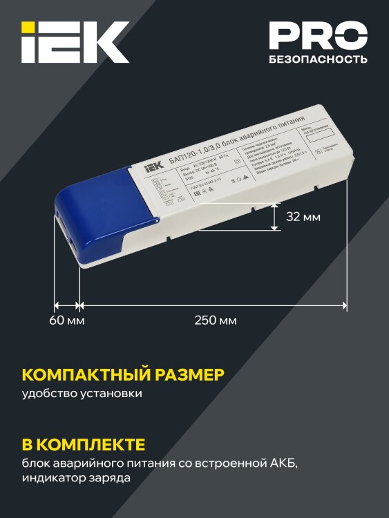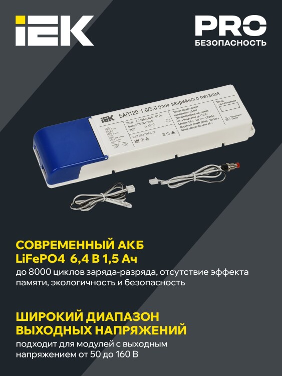 Блок аварийного пит ания (БАП) предназначен для обеспечения бесперебойного освещения помещений светодиодными светильниками в случае непредвиденного отключения сети 230В или при снижении порогового значения. Встраивается в схему питания светильника. Обязательным условием является наличие доступа к драйверу, а также входное напряжение светодиодного модуля должно находиться в рабочем диапазоне выходных напряжений БАП 50-160В.