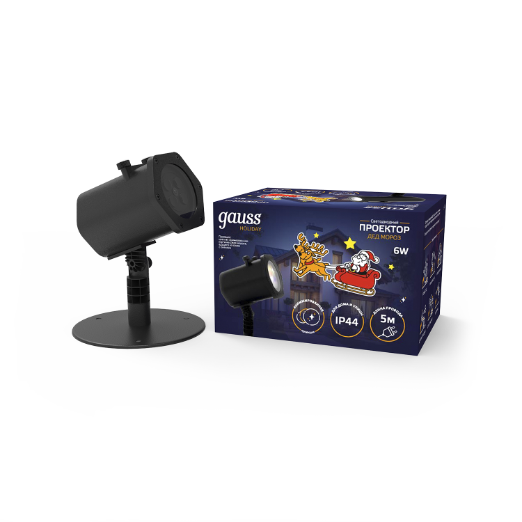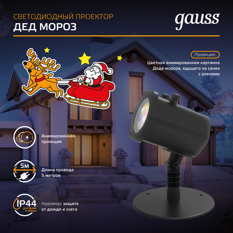 Лазерный новогодний проектор "Дед Мороз" создаст на стене, потолке, фасаде здания изображение главного персонажа, с которым у нас всегда ассоциируются желанные новогодние подарки – Дед Мороз и его верные олени. Проекция анимирована, Дед Мороз будет всегда мчать на санях. Воплощение новогодних чудес и праздника с проектором от Gauss – осуществимая задача.