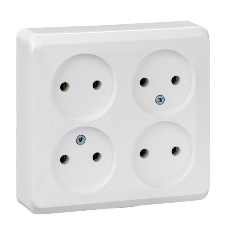 Розетка Systeme Electric (ранее Schneider Electric) ЭТЮД (белый, открытой установки) четырёхместная, без шторок и заземления предназначена для применения в сетях до 250В, на ток до 16А. Четырёхместная розетка позволяет подключить четыре устройства в одном месте. Она проста в установке и удобна в применении. Сделано в России.