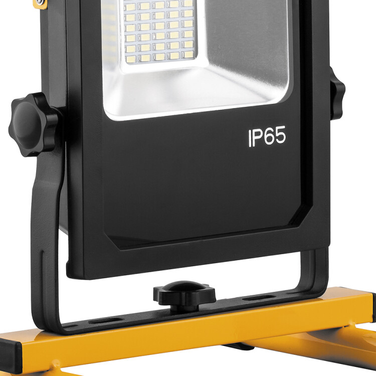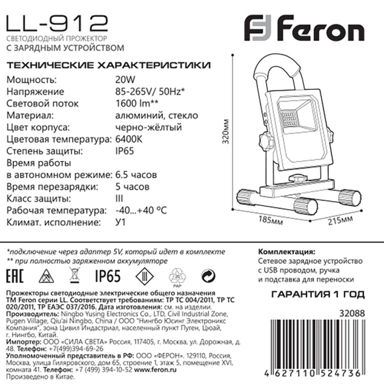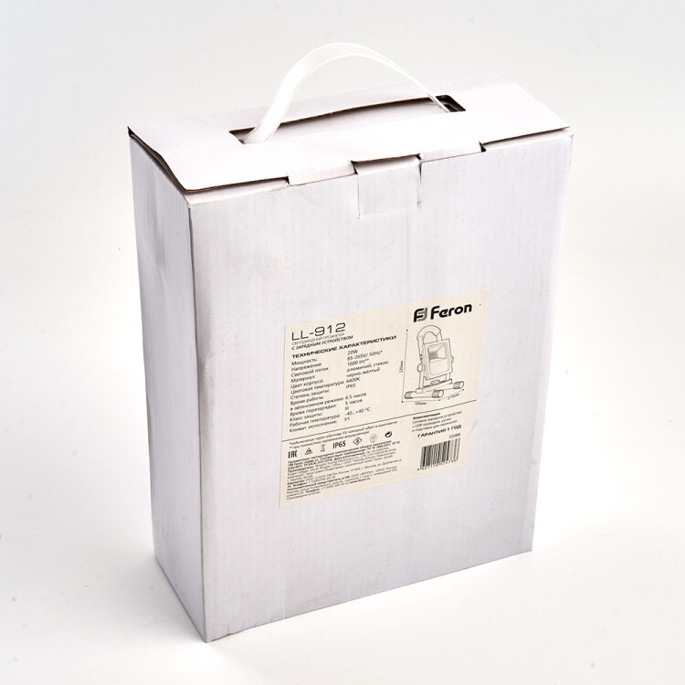 Прожектор светодиодный переносной с ручкой, с зарядным устройством (ДО) FERON LL-912, 20W, 6400К (холодный белый), 230V/50Гц, 1600Lm, IP65, угол рассеивания 120°,*SMD5730, раб.t -40°C - +40°C, цвет черный-желтый, корпус алюминий литой под давлением + стекло, 215*185*320 мм