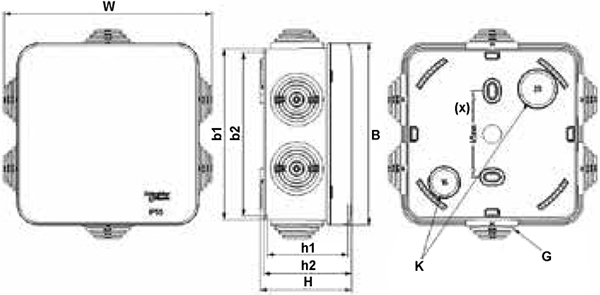 | B | b1 | b2 | W | h1 | h2 | H | K | G | (x) |