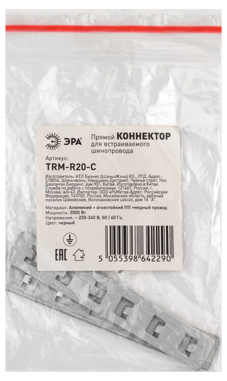 Коннектор представляет из себя 2 пластины, которые устанавливаются в пазы шинопровода и обеспечивают стабильную фиксацию за счет металлических упоров на пластине. Коннектор применяется с шинопроводами серии TRM-R20 и TRM-PC20