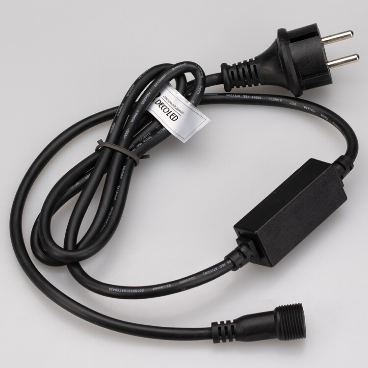Шнур питания для светодиодных гирлянд с эффектом мерцания. Материал оболочки РЕЗИНА (каучук). Цвет провода чёрный. В комплект входит: шнур питания с вилкой европейского стандарта (IP44), 2pin разъём подключения к гирлянде, выпрямитель AC/DC (1.6A). Длина провода 1.5 метра.