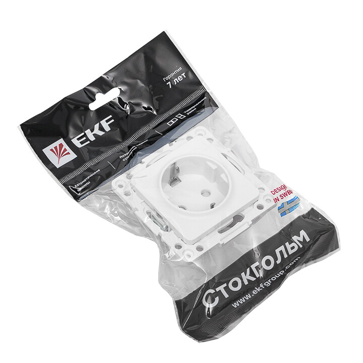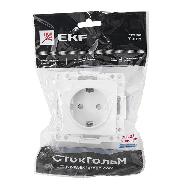 Розетка одноместная EKF EYR16-028-10 "Стокгольм" (16 А, IP20) скрытой установки, с заземлением и защитными шторками, белый
