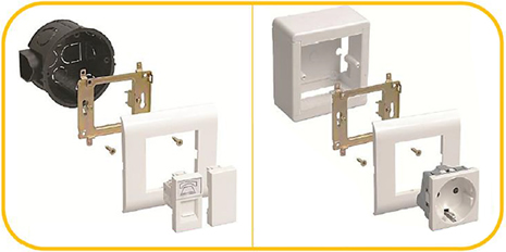 Монтируется в кабель-каналы "Праймер", в коробки универсальные типа КМКУ, либо устанавливается скрытым способом в стену.