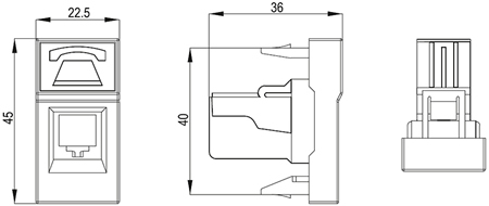 Розетка информационная RJ11 универсальной модульной системы 45 х 45 предназначена для подключения устройств абонентской телефонной техники, устанавливаемых в жилых, общественных и промышленных помещениях, к линиям телефонной сети.