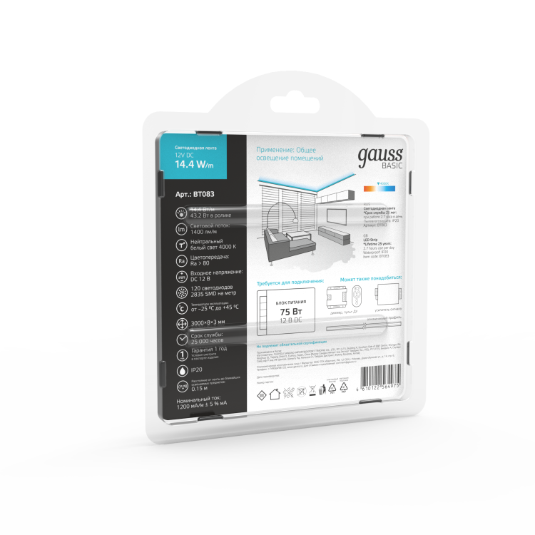 Ассортимент светодиодных лент Gauss способен решить ряд задач связанных как с декоративным освещением помещений, так и с экстерьерной подсветкой.