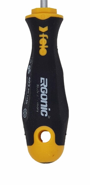 Отвертка Felo крестовая предназначена для монтажно-демонтажных работ с крепежом сечения PH 1.Рукоятка ERGONIC - первая в мире бесшовная рукоятка, которая адаптируется под руку любого пользователя, снижает нагрузку и утомляемость, а также увеличивает комфорт и максимальный крутящий момент. Продуманный дизайн рукоятки не позволяет инструменту скатываться с поверхности. Внешнее покрытие рукоятки имеет высокую устойчивость к царапинам и ГСМ.Отверстие в рукоятке позволяет для удобного хранения на стене, а также применять инструмент в качестве дополнительного рычага. На верхней части рукоятки указан тип шлица.Стержень изготовлен из высококачественной инструментальной стали, износостойкость и прочность которой превышает технические требования европейских стандартов DIN и ISO.
