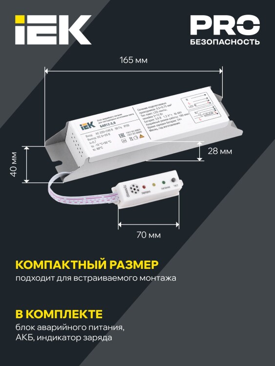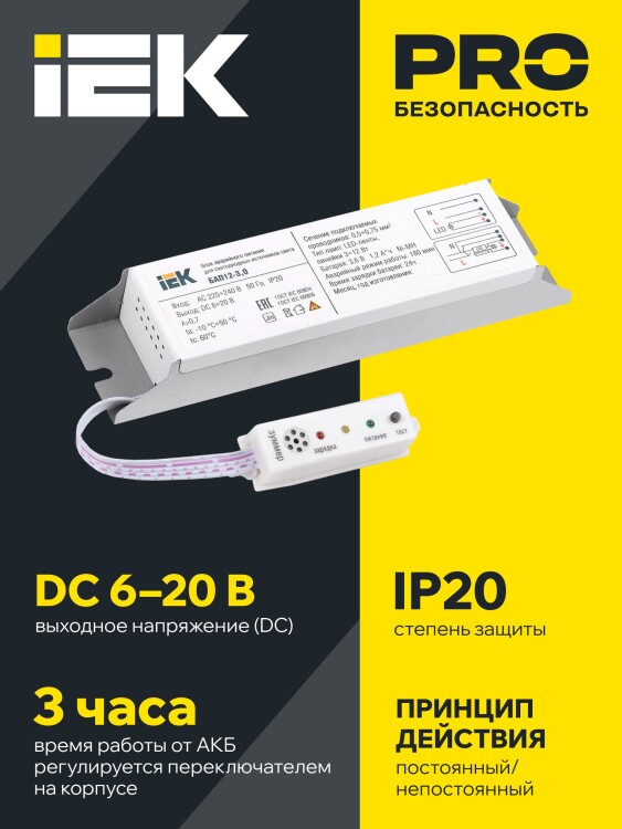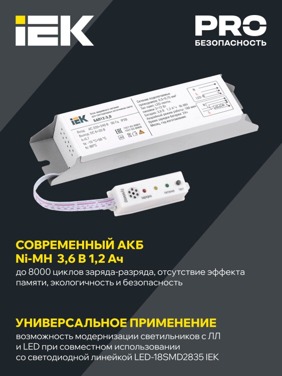 БАП12-3 IEK встраивается в светильник или в выносной бокс и обеспечивает работу в аварийном режиме светодиодных ламп, светодиодных модулей (СИД) и светодиодных лент напряжением питания 6-20 В и максимальной мощностью от 3 Вт до 12 Вт.