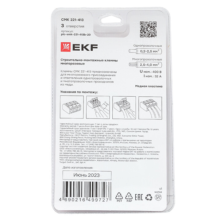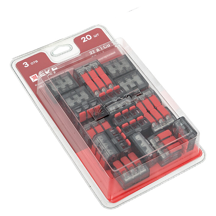 Каждая упаковка содержит по двадцать клемм. Прочный пластик дает дополнительную защиту изделиям, а лаконичный дизайн с яркими цветами выгодно выделяется на полках магазинов. Антивандальная упаковка полностью запаяна, что исключит ее несанкционированное вскрытие в магазине. Клеммы СМК предназначены для многоразового присоединения и ответвления одножильных и многожильных проводников из меди в электрических цепях переменного тока с частотой 50 Гц напряжением до 400 В. Клеммы можно использовать при температуре от –40 до +40° C и относительной среднегодовой влажности 60% при температуре 20° C. Во избежание перегрева в одну клемму предусматривается подключение проводов одного сечения.