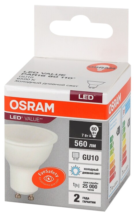 Лампа светодиодная OSRAM LED Value PAR16, 560лм, 7Вт (замена 60Вт), 6500К (холодный белый свет). Цоколь GU10, колба PAR16, угол пучка 110. Исполнение колбы матовое, пластик. Напряжение питания 220-240В. Товар сертифицирован.
