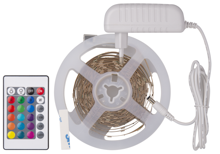 В комплекте светодиодная лента, адаптер, IR-контроллер с пультом ДУ и монтажный набор.